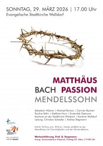 die Matthäus-Passion von Johann Sebastian Bach – in der Fassung von Felix Mendelssohn Bartholdy – aufgeführt. Dieses berühmte und – auch in seiner Besetzung – große Werk ist das gemeinsame Chorprojekt der beiden Kantoreien in Walldorf und Wiesloch.
