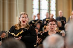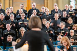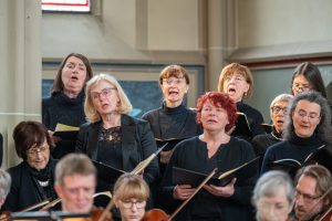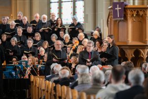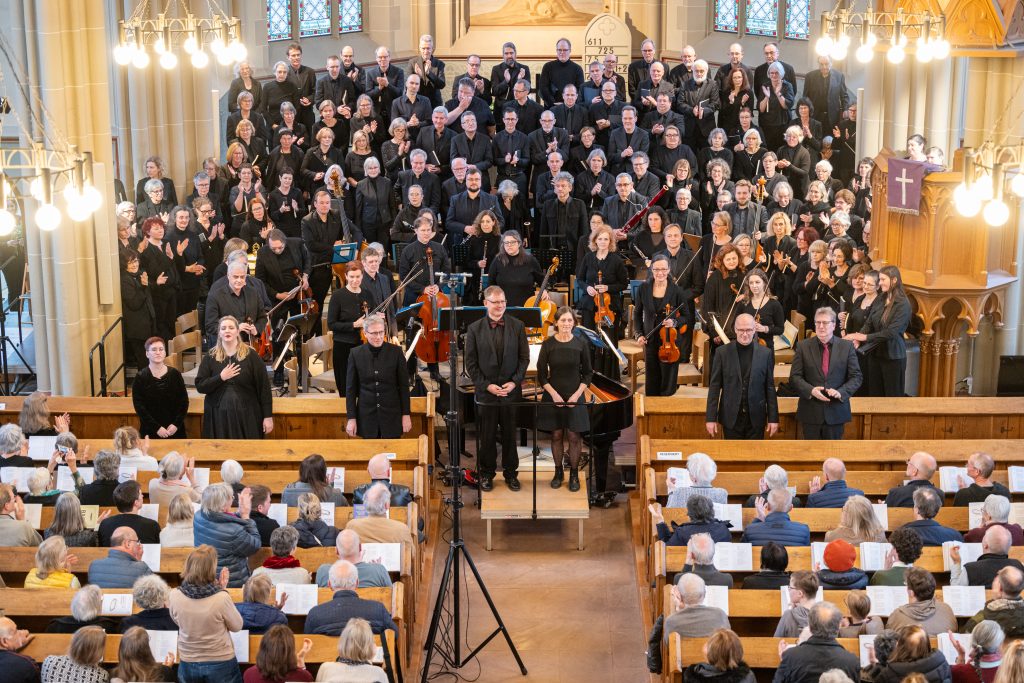 Bei der Einführung in das Werk am 20. März hatte Professor Bernd Stegmann die Matthäus-Passion als „Mount Everest der Kirchenmusik“ bezeichnet. Im wahrsten Sinne war es ein Kraftakt aller Beteiligten, umso schöner war es, nach Monaten der Planung, Vorbereitung und Proben endlich zum Konzert zu kommen. Die Kirche war bis auf den letzten Platz besetzt, und auf den Podesten im Altarraum drängten sich etwa 100 Sängerinnen und Sänger, die das Orchester umringten, das den Chor und die Solisten professionell begleitete.